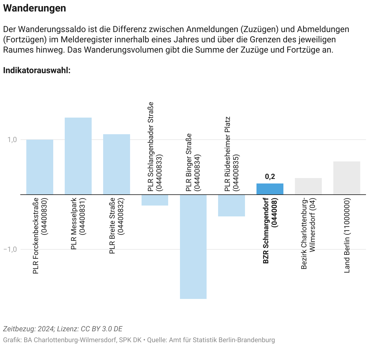 Der Wanderungssaldo ist die Differenz zwischen Anmeldungen (Zuzügen) und Abmeldungen (Fortzügen) im Melderegister innerhalb eines Jahres und über die Grenzen des jeweiligen Raumes hinweg. Das Wanderungsvolumen gibt die Summe der Zuzüge und Fortzüge an.