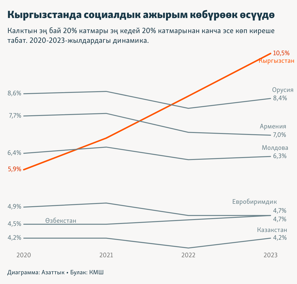 Калктын эң бай 20% катмары эң кедей 20% катмарынан канча эсе көп киреше табат. 2020-2023-жылдардагы динамика.