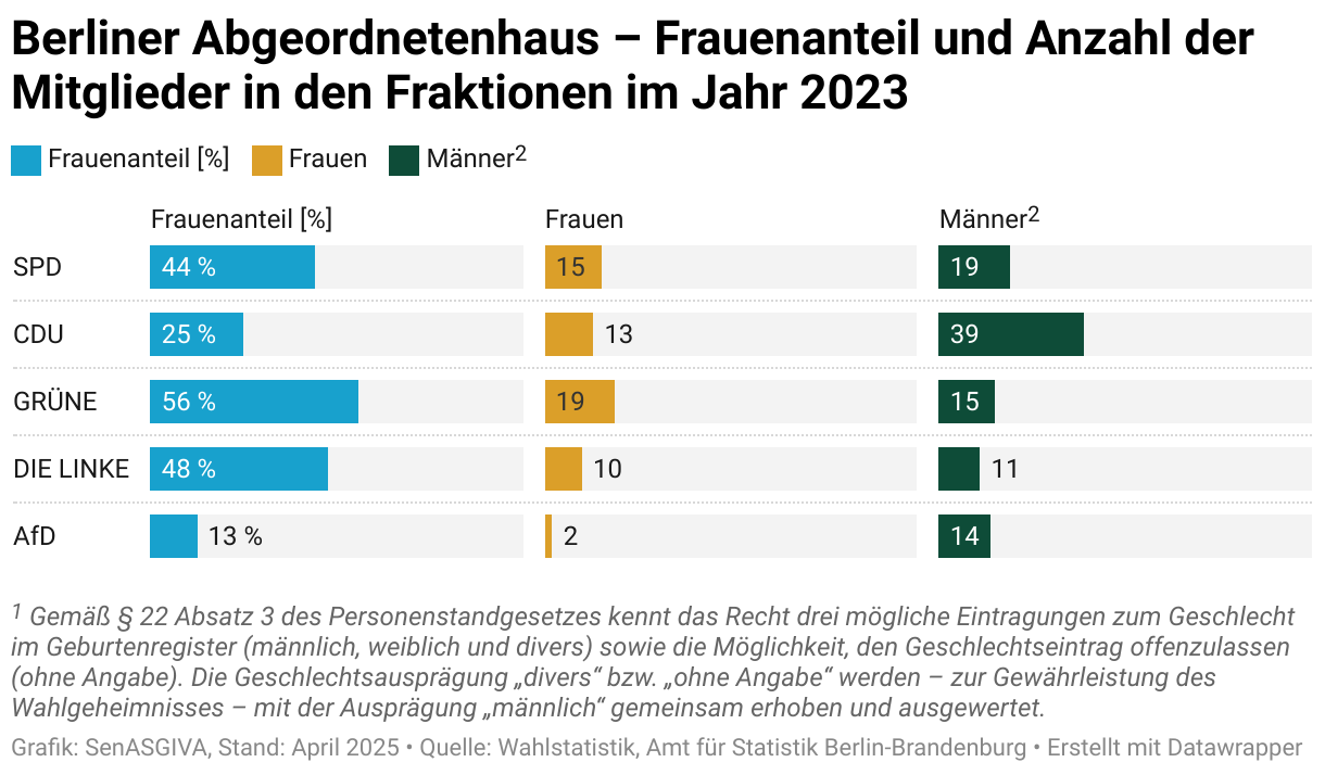 Berliner Abgeordnetenhaus – Frauenanteil und Anzahl der Mitglieder in den Fraktionen im Jahr 2023