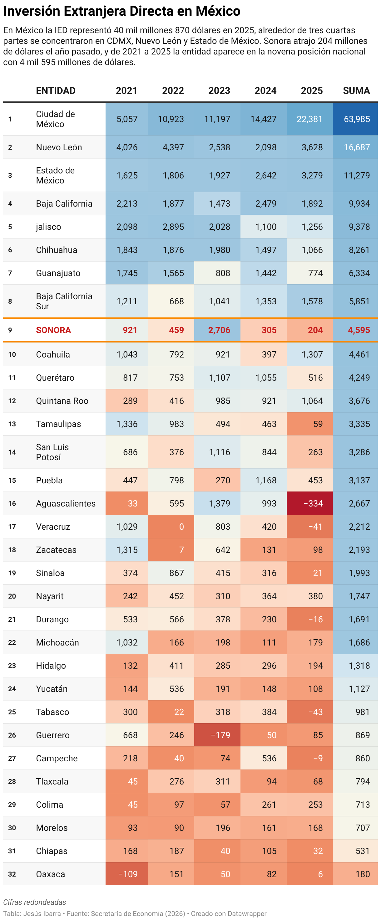 En México la IED representó 40 mil millones 870 dólares en 2025, alrededor de tres cuartas partes se concentraron en CDMX, Nuevo León y Estado de México. Sonora atrajo 204 millones de dólares el año pasado, y de 2021 a 2025 la entidad aparece en la novena posición nacional con 4 mil 595 millones de dólares.