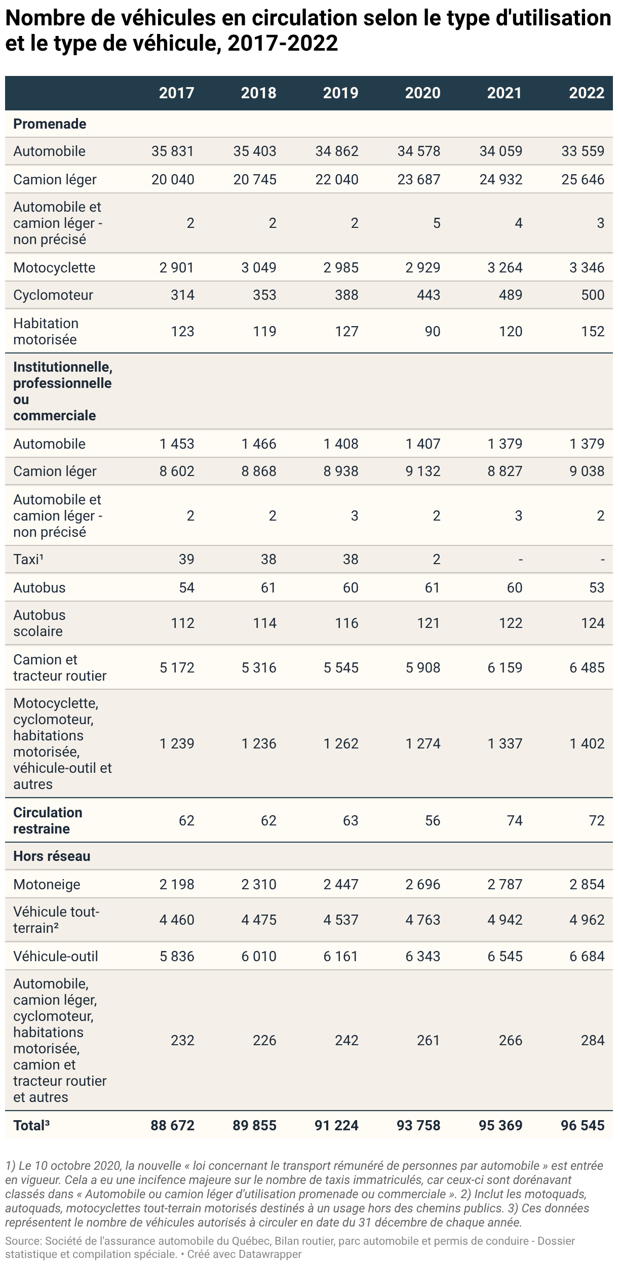 Nombre de véhicules en circulation selon le type d'utilisation et le type de véhicule, 2017-2022