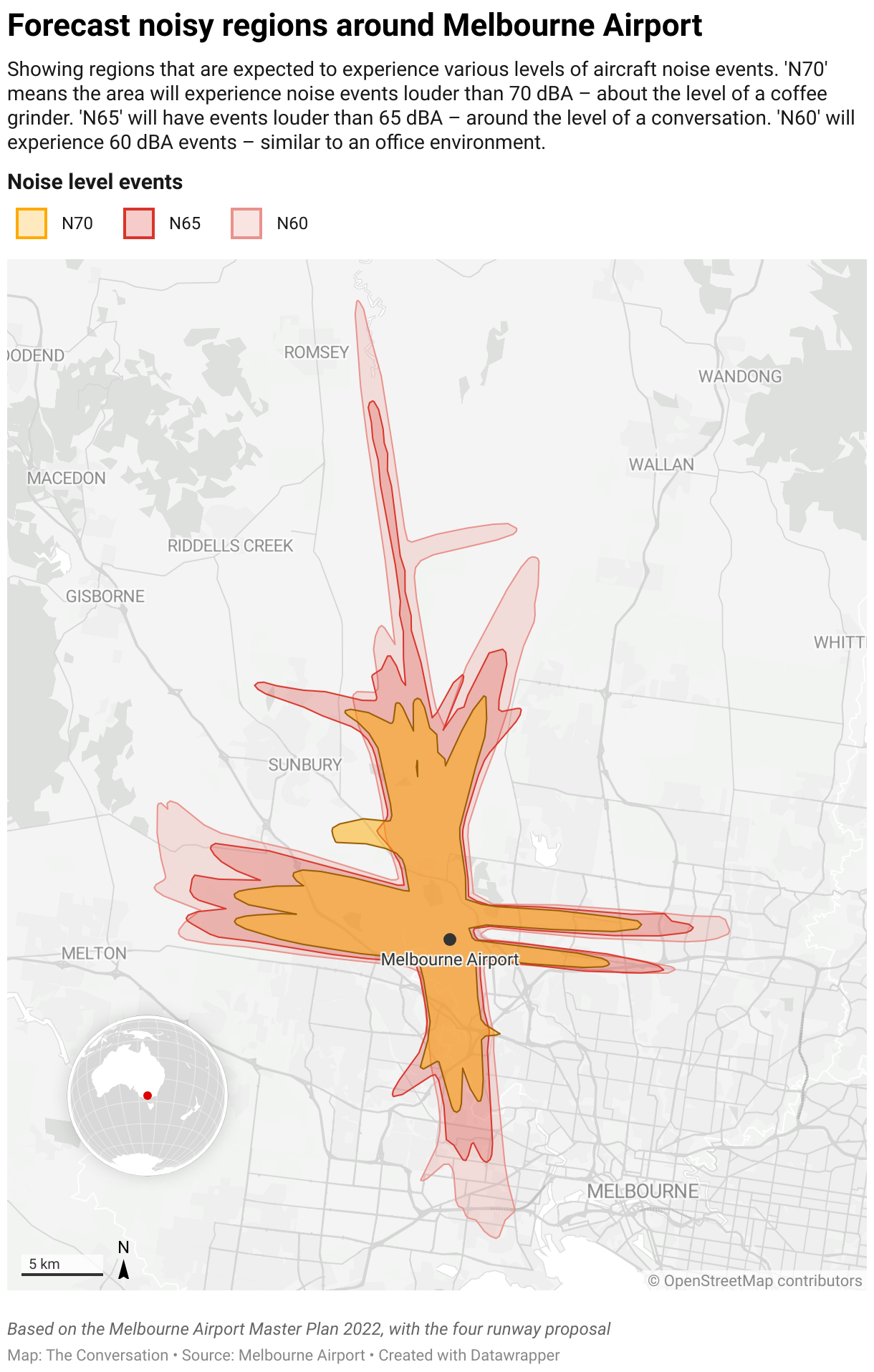 Showing regions that are expected to experience various levels of aircraft noise events. 'N70' means the area will experience noise events louder than 70 dBA – about the level of a coffee grinder. 'N65' will have events louder than 65 dBA – around the level of a conversation. 'N60' will experience 60 dBA events – similar to an office environment.