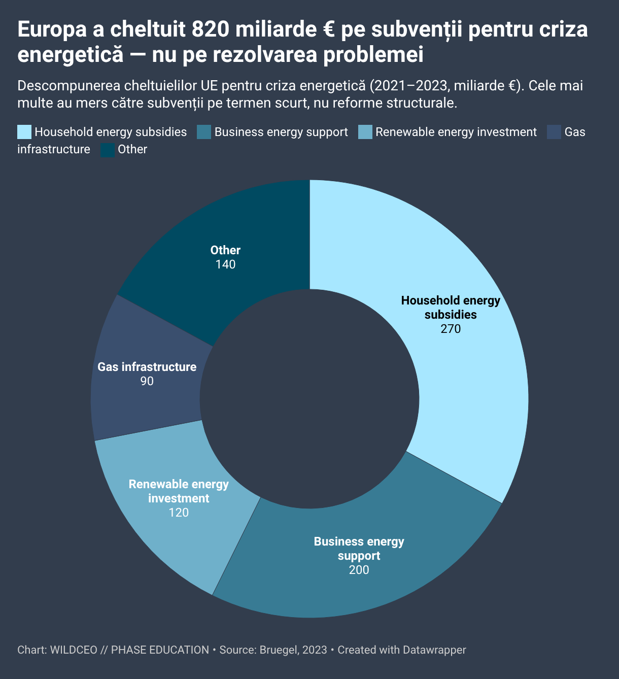 Donut chart breaking down Europe's €820 billion energy crisis spending. Shows how subsidies were allocated to short-term relief rather than long-term structural fixes to Europe's energy infrastructure.