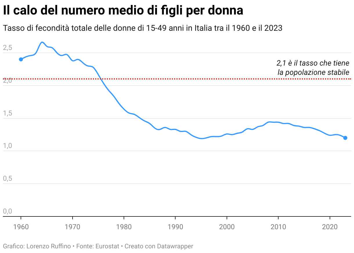 Tasso di fecondità totale delle donne di 15-49 anni in Italia tra il 1960 e il 2023